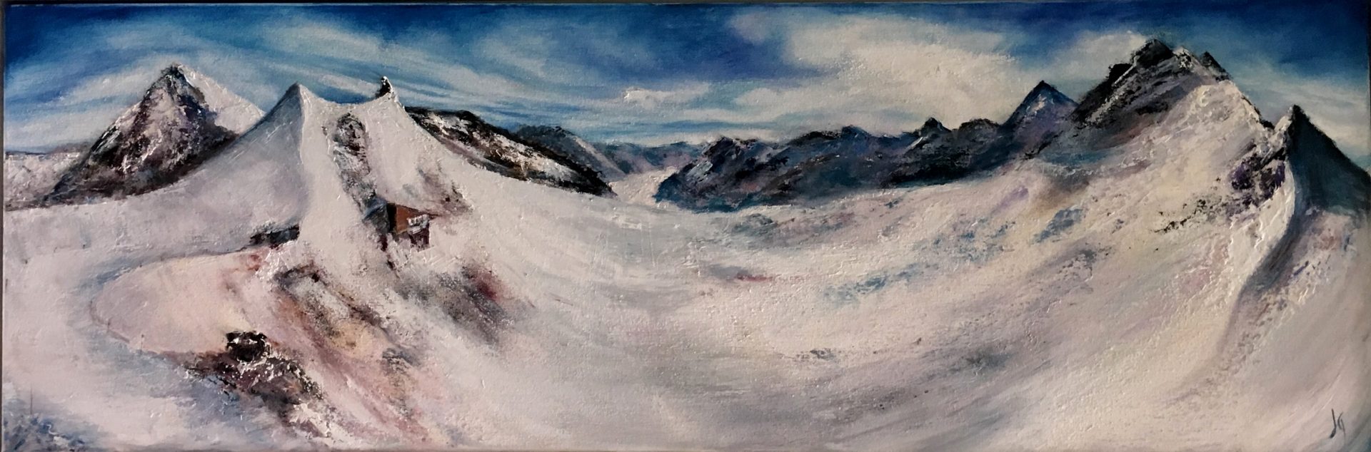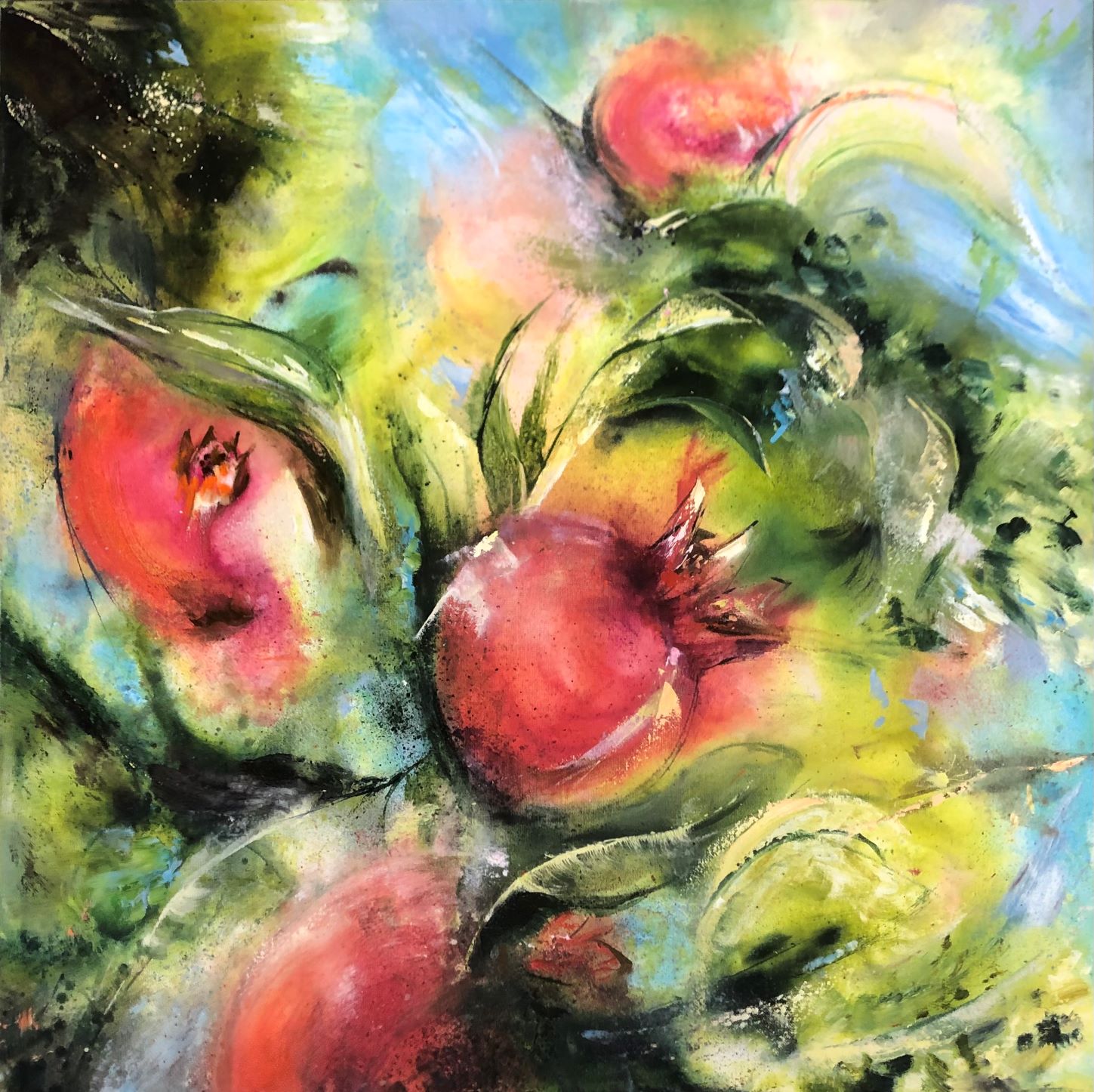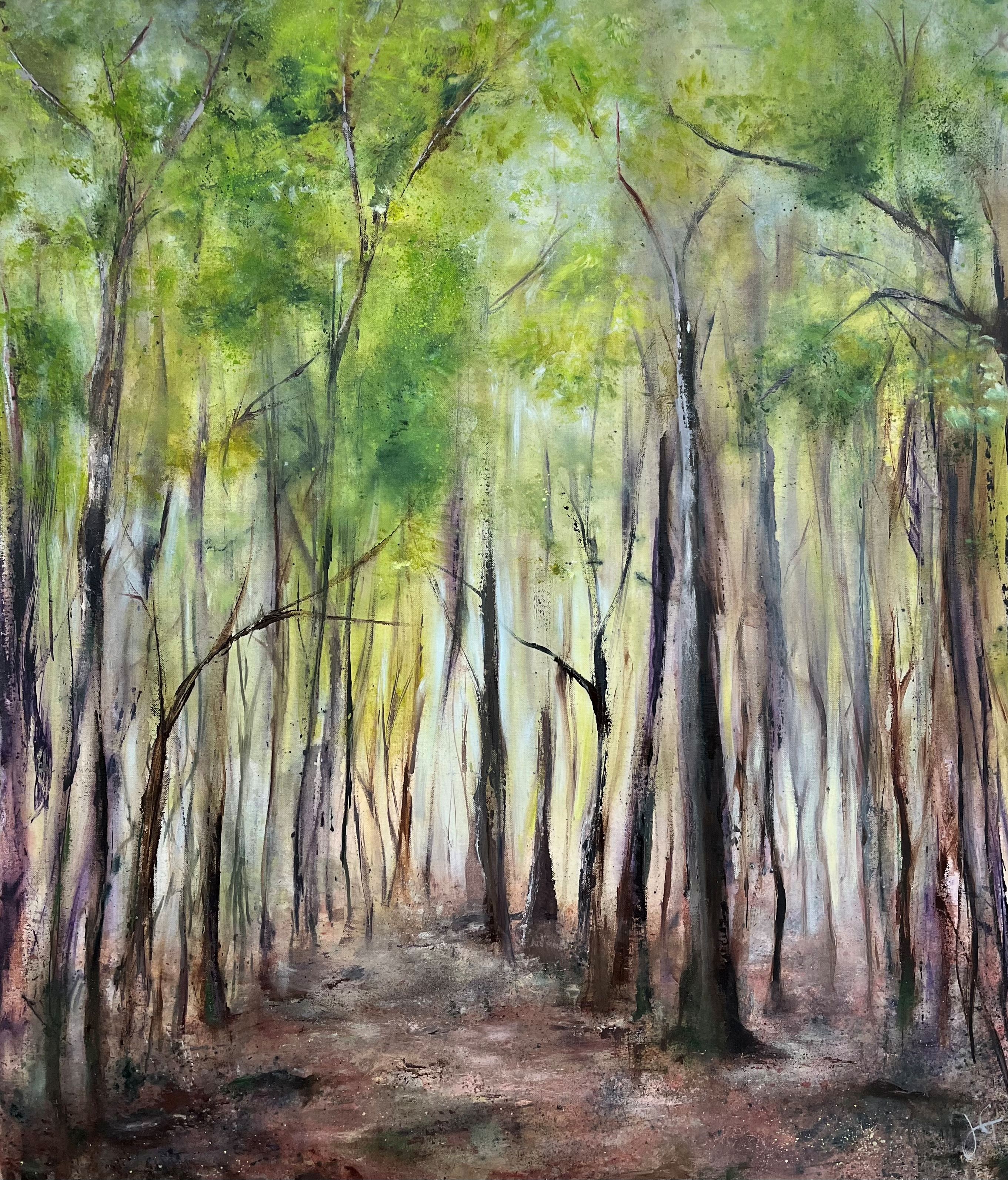 I love how colour can be built up and blended from its constituents using a palette knife and large soft brushes. I often start a piece working in acrylics and a lot of water to give a soft primary layer. I then work over this, mainly with oils, as I find they enable me to create depth and levels of colour, with constant blending and mixing of the paint to produce the hue and texture needed.
